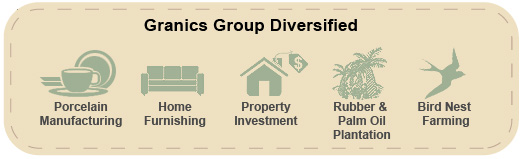 Granics Holdings Sdn Bhd, incorporated in year 1998, is an investment holding company base in Petaling Jaya. Granics Group’s activities including manufacturing and marketing of high quality porcelain tableware with Sirim Tested and ISO 9001:2008 recognition. Our local factroy is situated on a 1.5 acre land. We have set the revolution to produce quality product from dinner set to tea set and now extending to cook wares, home furnishings furniture and all kind of related products.